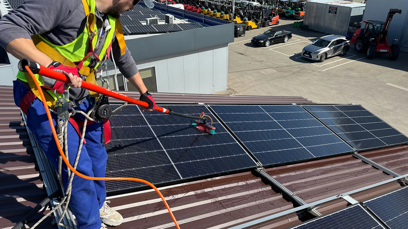 Prace rozpoczęto od szczegółowego przeglądu instalacji i oceny stopnia zabrudzenia. Następnie dobrano odpowiednią technologię mycia, uwzględniając zarówno rodzaj zanieczyszczeń, jak i specyfikę powłok paneli. Do czyszczenia wykorzystano demineralizowaną wodę oraz specjalistyczny sprzęt niskociśnieniowy składający się z teleskopowego kija z włókna węglowego zakończonego szczotką o delikatnych włóknach specjalnie zaprojektowanych do delikatnych powierzchni. Dzięki temu powierzchnia modułów została dokładnie umyta bez ryzyka zarysowania czy mikropęknięć.